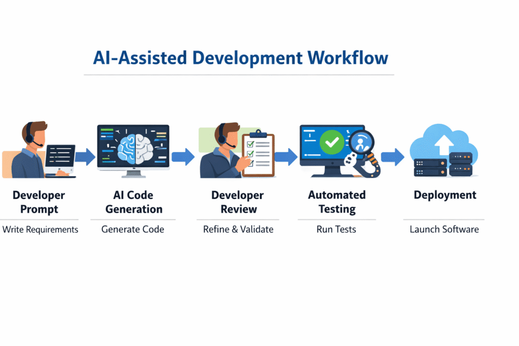 Instead of performing every task manually, developers collaborate with intelligent systems that assist with coding, testing, and optimization.